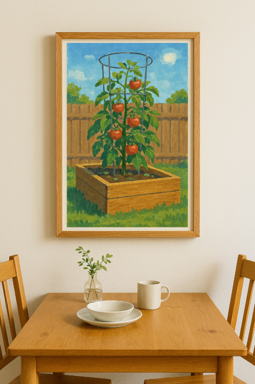 A raised wooden garden bed with a tomato cage structure heavy with ripening fruit. A suburban privacy fence sits softly in the background under bright midday sun. Matte, layered pigment texture gives the piece depth and realism.
