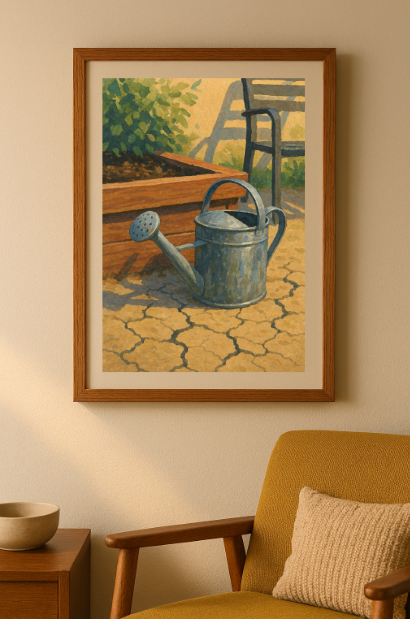 A metal watering can resting beside a raised bed, detailed with visible soil cracks and subtle shadows cast from a nearby patio chair. This intimate composition highlights the quiet details of hands-on gardening life.